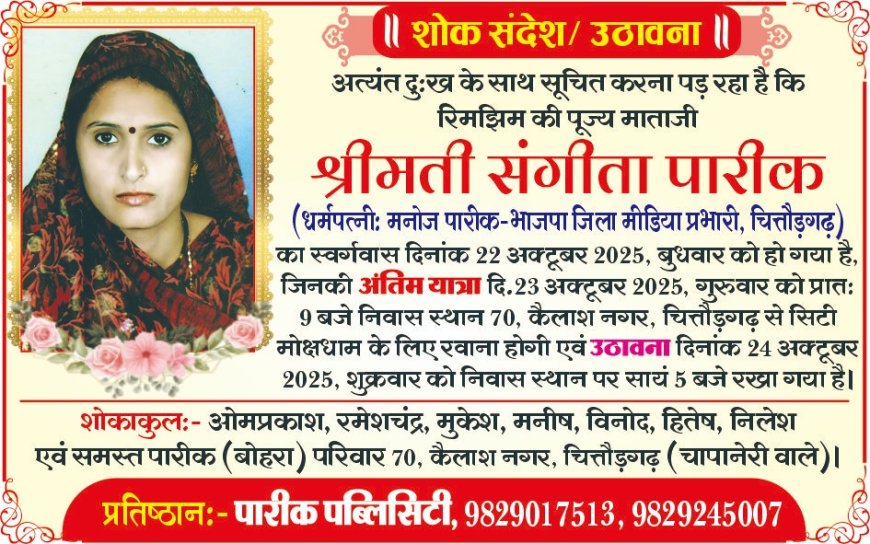 चित्तौड़गढ़ भाजपा जिला मीडिया प्रभारी मनोज पारीक की धर्मपत्नी संगीता पारीक का निजी अस्पताल में हृदयाघात से निधन हो गया । उनके निधन से पूरे परिवार में शोक की लहर छा गई है वे अपने पीछे एक पुत्री छोड़ कर गई हैं । संगीता की अंतिम यात्रा गुरुवार सुबह 9 बजे मनोज पारीक के निवास स्थान कैलाश नगर से सिटी मोक्ष धाम के लिए रवाना होगी