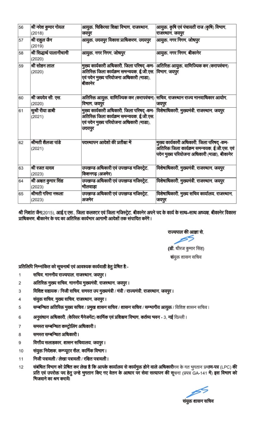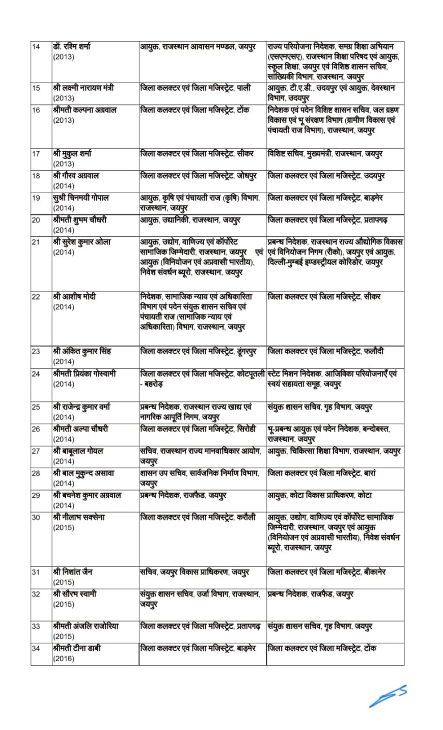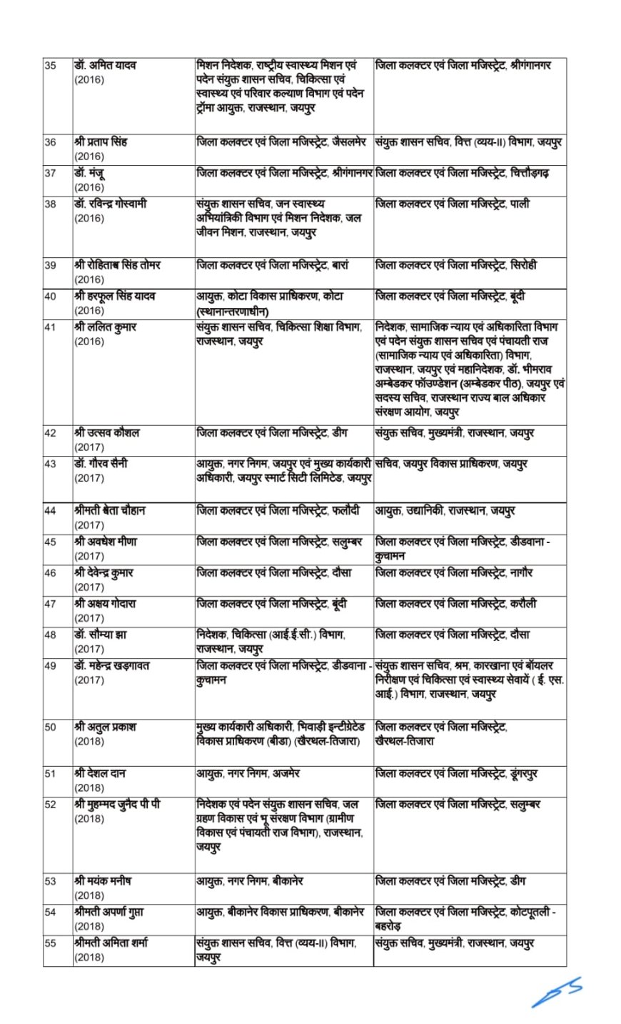 चित्तौड़गढ़ राज्य सरकार ने मंगलवार देख रहा था एक आदेश जारी कर करीब 66 आईएएस अधिकारियों के ट्रांसफर किए हैं चित्तौड़गढ़ जिले की कमान 2016 की प्रशासनिक अधिकारी डॉ मंजू के हाथ में दी गई है वह चित्तौड़गढ़ की नई जिला कलेक्टर होगी वही चित्तौड़गढ़ जिला कलेक्टर आलोक रंजन को जोधपुर जिला कलेक्टर लगाया गया है जबकि जोधपुर जिला कलेक्टर गौरव अग्रवाल को उदयपुर जिला कलेक्टर के पद पर लगाया गया है इसी तरह पाली सीकर जयपुर डूंगरपुर प्रतापगढ़ सहित कई जिलों के जिला बदल दिए गए हैं
