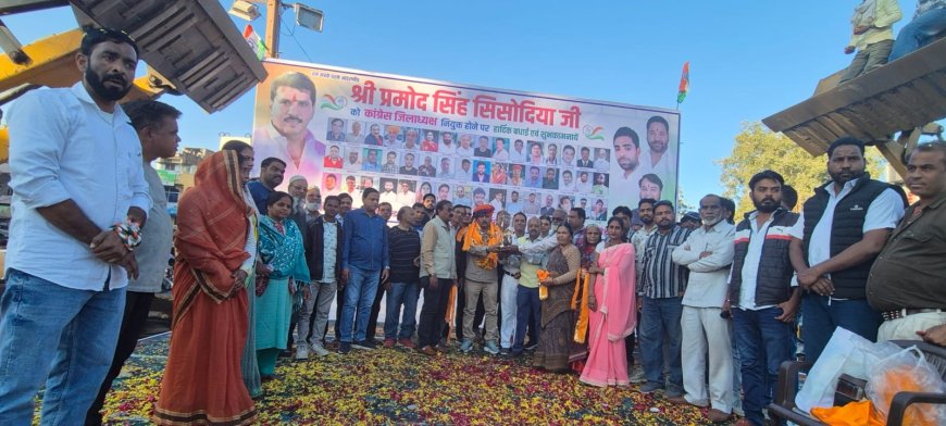 कांग्रेस के नवनियुक्त जिला अध्यक्ष प्रमोद सिंह सिसोदिया का शहर के सुभाष चौक पर कांग्रेस हेरिटेज जोन मंडल के अध्यक्ष व अल्पसंख्यक कांग्रेस जिलाध्यक्ष इम्तियाज हुसैन लौहार के नेतृत्व में कांग्रेस कार्यकर्ताओं, व्यापारियों की मौजूदगी में जोरदार स्वागत किया गया।