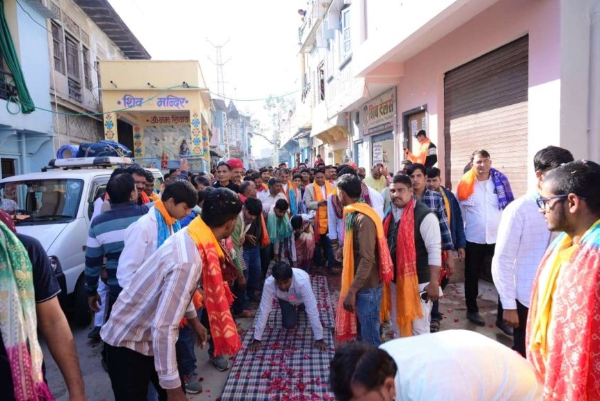 बैंड-बाजों व ढोल की धुनों के बीच निकली इस भक्तिमय यात्रा में बड़ी संख्या में ग्रामवासी एवं महिलाएं नृत्य करते हुए शामिल हुए। सांवलियाजी मंदिर परिसर पहुँचकर उपस्थित जनों ने विधायक चन्द्रभान सिंह आक्या का माल्यार्पण कर, मेवाड़ी पगड़ी पहनाकर सम्मान किया। साथ ही परंपरानुसार उन्हें सिक्कों से तौला गया, जिन सिक्कों को बाद में सांवलियाजी मंदिर के भण्डार में अर्पित किया गया।