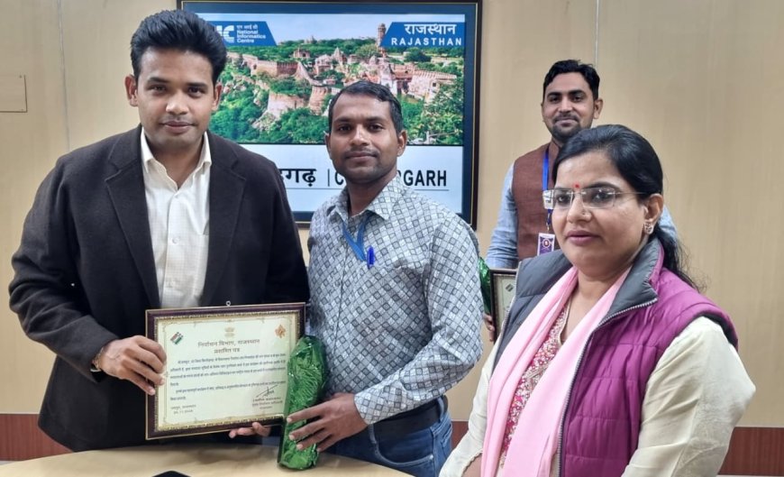 मुख्य निर्वाचन अधिकारी नवीन महाजन की विडियो कॉन्फ्रेंसिंग के दौरान जिला निवार्चन अधिकारी आलोक रंजन ने शत प्रतिशत ऑनलाइन कार्य करने वाले दो बीएलओ को प्रशस्ति पत्र देकर सम्मानित किया।
