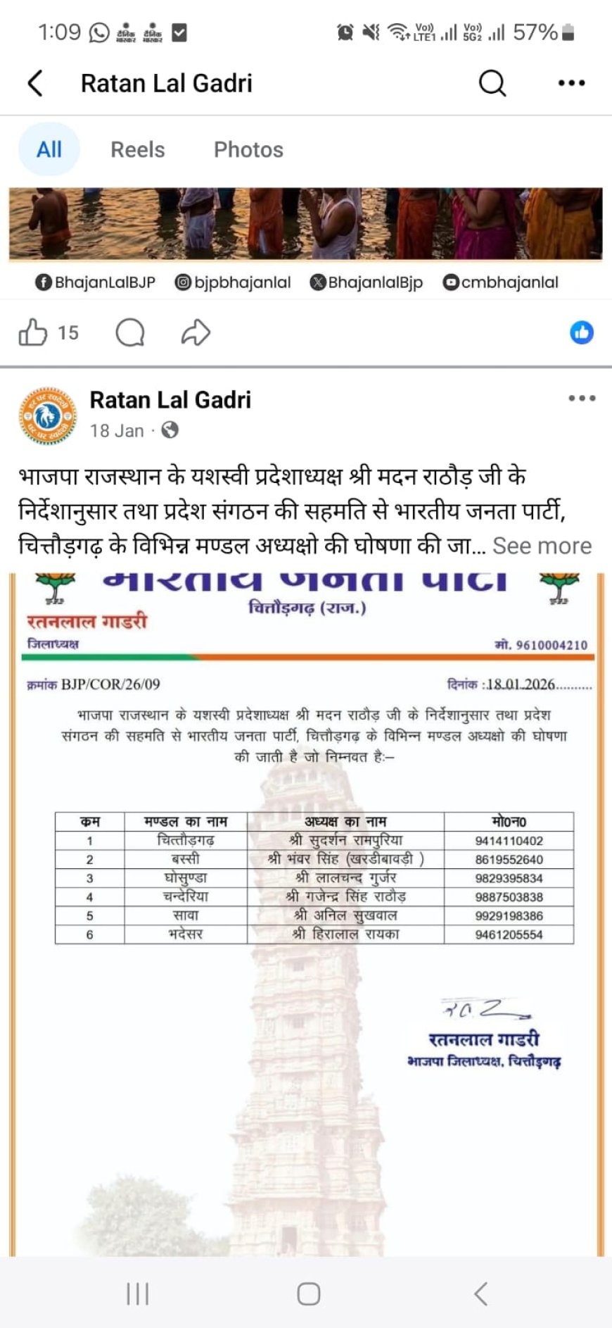 चित्तौडग़ढ़ भारतीय जनता पार्टी के जिलाध्यक्ष रतन गाडरी ने लम्बे समय बाद चित्तौडग़ढ़ विधानसभा के छह मंडल अध्यक्षों की घोषणा गत 18 जनवरी की देर रात की थी। इस सूची में जो ६ मंडल अध्यक्ष बने इनमें से 5 चित्तौडग़ढ़ विधायक चन्द्रभान सिंह खेमे से थे। इनमें से कुछ नाम तो वह थे जब चन्द्रभान सिंह आक्या का टिकट कटा और तत्कालिन प्रदेश अध्यक्ष एवं सांसद सी. पी. जोशी के निर्देश पर इसमें पूर्व मंडल अध्यक्षों को पार्टी के उम्मीदवार के खिलाफ रहने के कारण हटाया गया था। लेकिन भाजपा संगठन के एक राष्ट्रीय पदाधिकारी की समझाइश के बाद सांसद सी. पी. जोशी एवं विधायक चन्द्रभान सिंह में एका हुआ और करीब ढाई साल बाद यह एक साथ नजर आने लगे। इसके बाद से ही दोनों के समर्थकों में सदैव ऊहापोह की स्थिति बनी रही। धीरे-धीरे हालात सामान्य हो ही रहे थे और 18 जनवरी की रात को भाजपा जिलाध्यक्ष की ओर से जारी चित्तौडग़ढ़, बस्सी, घोसुण्डा, चंदेरिया, सावा और भदेसर मंडल के अध्यक्षों की घोषणा ने एक बार फिर जिला भाजपा संगठन में बवाल खड़ा कर दिया। अब सांसद सी.पी. जोशी के समर्थकों को यह ना तो उगलते बन रहा है और ना ही निगलते बन रहा है। जब विरोध के धीमेे स्वर मुखर होने लगे तो 22 जनवरी को नेताजी को कुछ सालों पूर्व एक भूखण्ड के मामले में आरोपों के घेरे में खड़े करने वाले युवा नेताजी ने पूरे असतुंष्ठ खेमे को अपने घर पर बुला एक बैठक भी कर ली। उस बैठक में स्वयं सांसद सी. पी. जोशी, जिला संगठन के पदाधिकारी, पूर्व पार्षद, पंचायती राज से जुडे नेताजी, निवर्तमान मंडल अध्यक्ष सहित करीब साठ से सत्तर पदाधिकारी एवं कार्यकर्ताओं ने भाग लिया। वहां पर सब ने मंडल अध्यक्षों की घोषणा पर सवाल खड़े किए तो सांसद सी.पी.जोशी ने यह कह कर पल्ला झाड लिया कि उन्हें इसकी खबर ही नहीं लगी। यह बात जब आम आदमी के गले नहीं उतर रही तो फिर भाजपा संगठन में वर्षो से काम करने वालों के गले कैसे उतर सकती थी। इसी के चलते पंचायती राज वाले नेताजी को भी बीएमएस के हमले का जवाब देने का मौका मिल गया और उन्होंने तुरंत ही भाजपा के प्रदेश अध्यक्ष मदन राठौड़ को फोन लगाया और जैसे ही यह पता लगा कि वे उदयपुर प्रवास पर है तो वह तीस चालीस लोगों के साथ उदयपुर पहुंच गए। प्रदेशाध्यक्ष से जिलाध्यक्ष रतन गाडरी की घोषणा पर जब आपत्ति जताई तो उन्होंने यह कहते हुए पल्ला जाडा कि यह तो सब जिलाध्यक्ष, सांसद एवं विधायक की सहमति से हुआ है और दिल्ली की यात्रा इसकी गवाह है। जहां पर जिलाध्यक्षजी के साथ सांसद जी के घर पर विधायकजी से भी मुलाकात हुई थी। फिर भी अगर आपत्ती है तो इसे होल्ड पर डालने का आश्वासन दे दिया। इसके बाद भी जब कोई समाधान निकलता नहीं दिखा तो असतुंष्ट खेमे २९ जनवरी तक का अल्टीमेटम दिया इसके बाद एक बार फिर भाजप